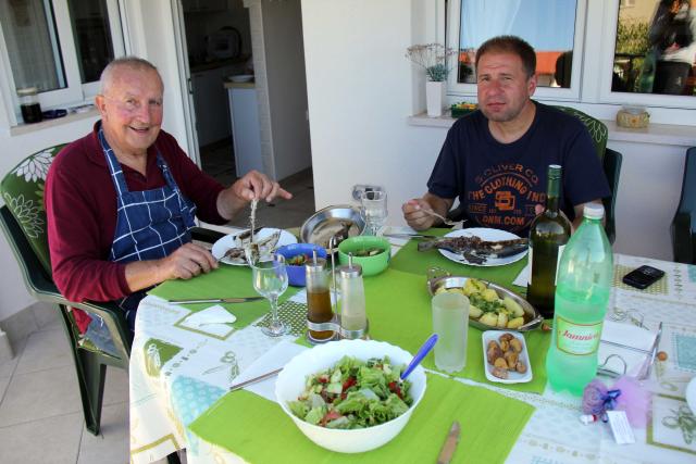 Vmes pa nama je podal še vrsto zanimivih informacij, med drugim nama je povedal zgodbo o hotelskem kompleksu Haludovo, kjer so se v poznih sedemdesetih letih zabavali mnogi svetovni bogataši, med drugim tudi Hugh Heffner in njegova elita. Povedal nama je tudi zgodbo o nunah iz samostana v Poratu, za katero pa ga povprašajte sami ob obisku. J Silvovi gostoljubnosti pa ni bilo konca, ker je mojster žara pa se je ponudil, da nama pripravi odlično kosilo. Zakonca Pungeršek pravita da so zadovoljni gostje njuna sreča, zato se trudita da se ob njima počutijo zares domače. Glede na knjigo gostov in na svoje lastne izkušnje se mi zdi da je domovanje v tem apartmaju na nivoju, kot da bi se odpravil na obisk k dedku in babici, ki z veseljem poskrbita za vas. Poleg vsega pa sem v dar dobila tudi vrečko domače sivke, ki še vedno zelo lepo diši.