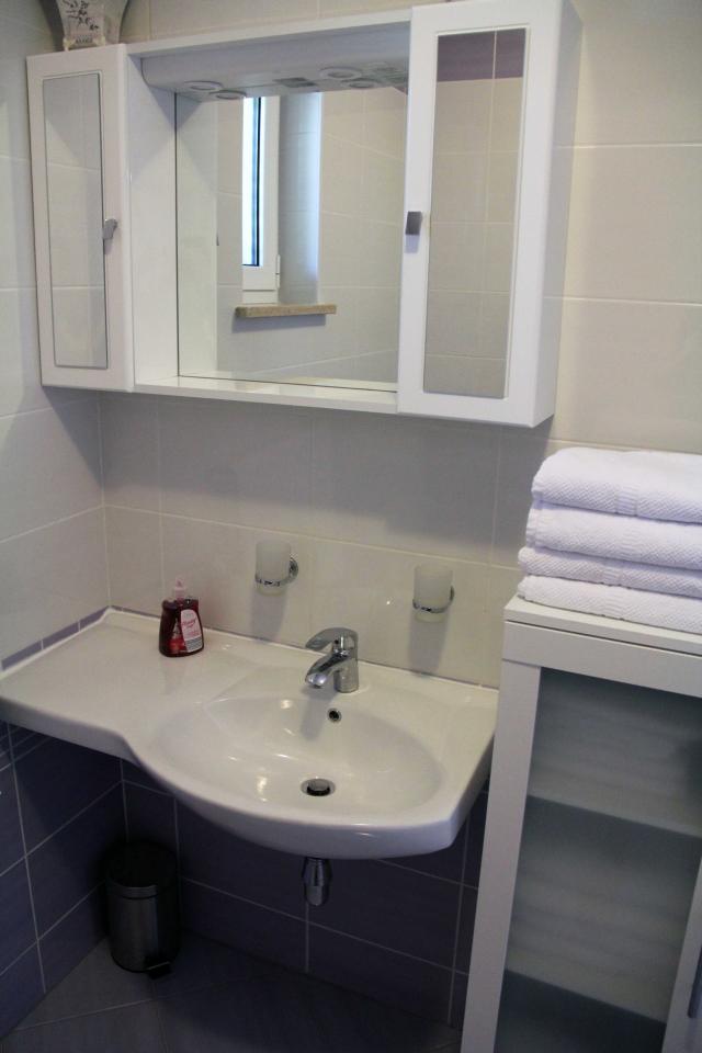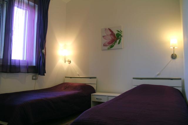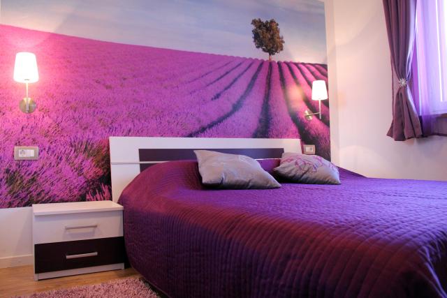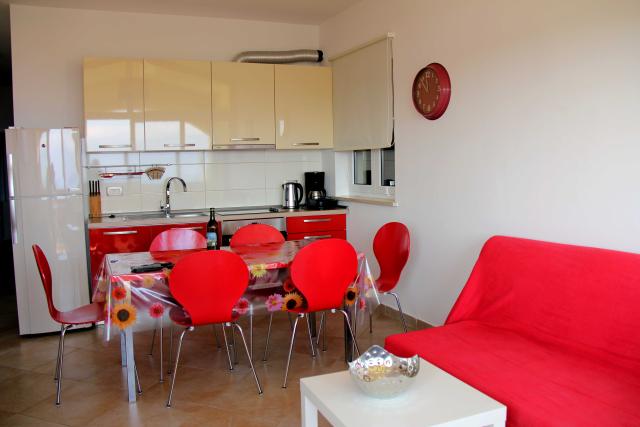 Prvi apartma je narejen za 4+1 oseb (raztegljiva zofa, primerna lahko tudi za dve osebi). Drugi apartma pa za 2+1 oseb (raztegljiva zofa, primerna lahko tudi za dve osebi). Ko sva vstopila v apartma sva pred seboj zagledala kombiniran dnevni prostor s kuhinjo, jedilnico in dnevno sobo s kavčem in satelitsko televizijo, ter seveda prečudovito pokrito teraso opremljeno z stoli in mizo. Po hodniku se sprehodiš do glavne spalnice, nežne viola barve s sivkinim poljem, ki je narisano na platnu nad zakonsko posteljo. Glavna spalnica ima tudi svoj ločen WC. Zraven glavne spalnice je še ena spalnica z ločenima ležiščema, ki se jih po želji lahko združi in postane zakonska postelja. Skozi okno ti pogled uide na oljke ki so posajene v okolici. Apartma ima prostorno kopalnico z modernim tušem in WC-jem, v kateri so naju pričakale sveže, mehke in dišeče brisače, novo milo in sušilec za lase. Kuhinja je moderno opremljena z električnim štedilnikom in pečico, hladilnikom, vso potrebno posodo, aparatom za kavo, toasterjem, kuhalnikom vode, kuhinjskimi krpami, vrečkami za smeti itd.