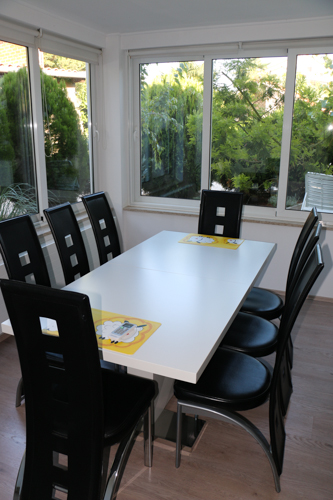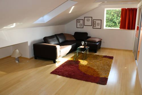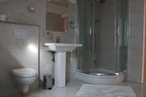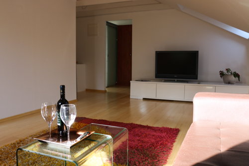 Povzpnem se po stopnicah v apartma Eni, 4+1. Apartma ima na desni strani eno sobo z zakonsko posteljo in eno sobo z dvema ločenima ležiščema . Kopalnica je svetla, opremljena z bidejem, kopalno kadjo, umivalnikom. Kot najbolj topel prostor začutim dnevno sobo in balkon. V dnevni sobi udobna, velika, bela sedežna garnitura, ki kar vabi k počitku. Dnevni prostor je z jedilnico in kuhinjo povezan. Prostora za kuho in druženje je več kot dovolj. Balkon je opremljen z enostavno rjavo garnituro z belimi blazinami. Opremljen je tudi s pultom za odlaganje pijače, prigrizkov. Zaključim, da to zagotovo je apartma, ki bi ga upala priporočiti tudi zahtevnejšim dopustnikom. Cene tega apartmaja se gibljejo od 425,00kn izven sezone do max 750,00 kn v glavni sezoni. Dodatno ležišče stane 75,00 kn.