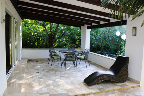 Veliko sence, kamna, urejen vrt. Najprej opazim mizico s stoli. Pred soncem jo ščitijo streha in kamnite stene. Celo aparat za kavne napitke je poleg. Pozabili niso niti kotička za otroke.